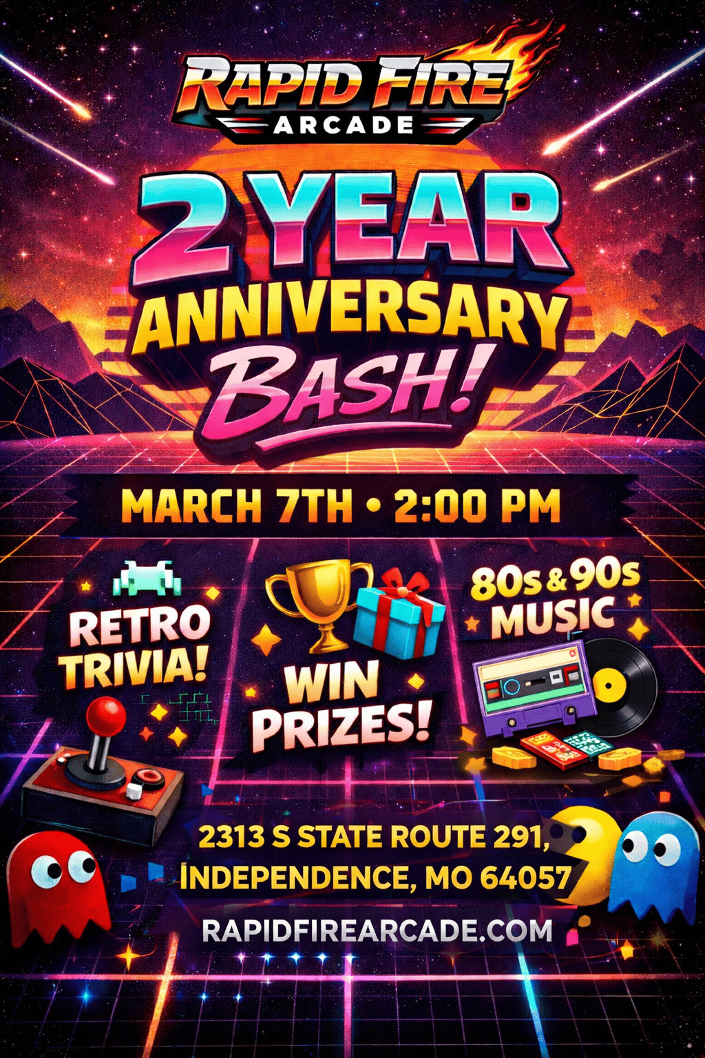 Come celebrate Rapid Fire Arcade's 2 year anniversary! We'll have retro trivia, prizes to win, and your favorite music from the 80s & 90s!Event kicks off at 2:00 pm.